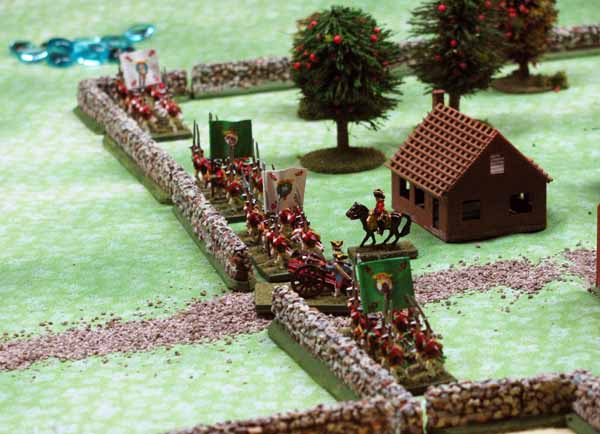 This is the walled field in which the second of the French brigades was delplyed. Eventually half the infantry and the gun began to move to the main part of the village when the British moved around to the right of the houses.