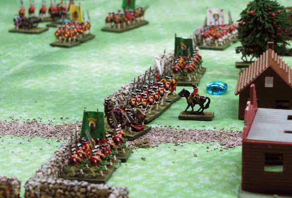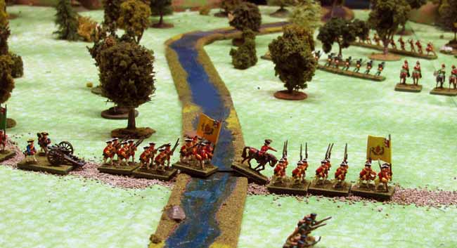The head of the British line forces moves through a small stream on the barely improved road. There are no limbers, the small "battalion guns" are being pushed along by their artillerists..