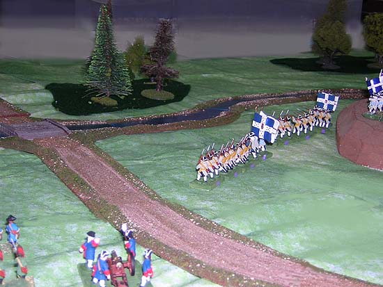 Two brigades of Prussian infantry, including grenadiers and two brigades of cavalry are moving over the stream on the Prussian right.