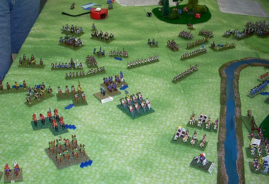 Action commences on the French left as two Prussian cavalry and two infantry brigades begin to attack the French. With only two cavalry brigades on this flank initially, the French commander (the Marquis de Florida) had to hastily call up his reserve cavalry and infantry brigades.