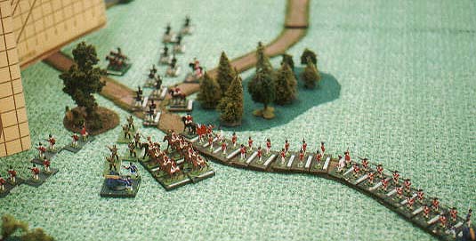 Turn one! The screen has come down. Light troops stretch left and right in open order. Columns of redcoats march for the one marked ford over the stream.