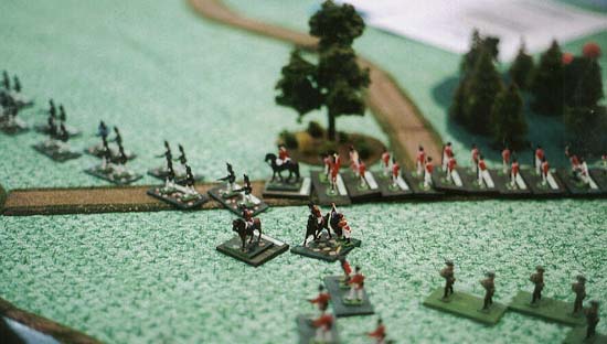 Travis later faced the troops he was moving to their left (right in the photo) to guard against four stands of Patriot cavalry that showed up in the corner of the table (where the opened gray box is in this photo.) These mounted troops kept two British regiments in line awaiting a cavalry assault that never came.