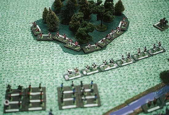 The center of the line at one of the turning points of the game. Loyalist and Patriot light infantry struggle for the woods in the center of the line. If these woods fall to the British, the Patriot advanced battery that did such good work will have to be destroyed. To the left long lines of troops blaze away at each other.