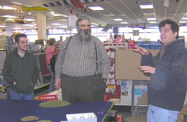 At Hobbytown, before the start of a game. From left, Sean Pitts, Robert Whitfield, and John Stangel. John was the game-master of this Napoleonic naval game, at Hobbytown in north Jackson MS, around 2005.