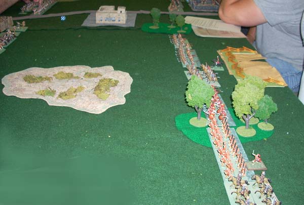 Ipso Facto's heavy infantry has closed with Thesaurus Xylophone's light infantry. Even with Xylophone's leader attached his unit has suffered 2 morale hits (note the dead figures behind the unit).