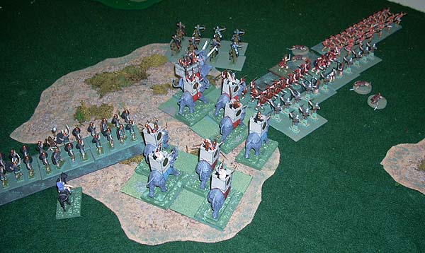 Two of Ipso Facto's units were locked in melee with Thesaurus Xylophone's troops when the elephant's hit their flank. The cavalry in the rear were light cavalry and were not allowed to melee.