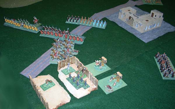Jim Pitts - Punctilius Pictianus and Ed Sansing - Cialus Magnus took the photos and wrote most of the commentary below. I, your humble web-master, merely added a few lines and did some reorganizing. My main part in the battle was to roll my dice incredibly poorly and thus watch most of my troops be swept from the field (Jay Stribling - Gladius Tucia).