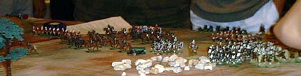 Marc Fluitt (standing) runs a beautiful Pig Wars game at FUZILEER MUSTER 2004 in Hattiesburg Mississipi on Febbruary 7.. Set in the dark ages, "when men were men, and pigs were money" this game pitted more heavily armored Vikings against lighter armored, but more numerous Saxons. I believe that the Saxons triumphed after a long struggle.