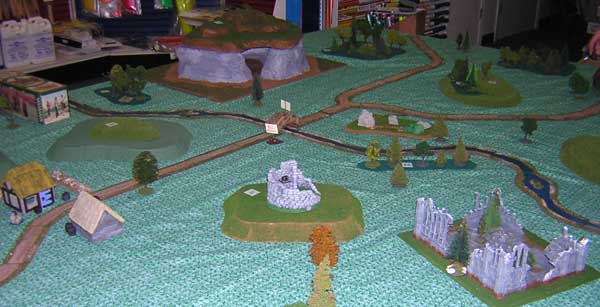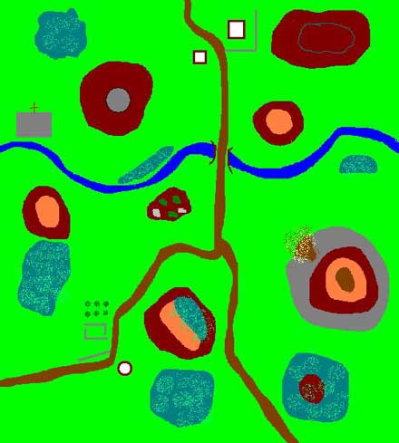 village The dark brown splotch with smaller gray and green splotches is rough ground. The brown and yellow area leading from the Dragon's Lair is the entrance. The darker green with lighter green dots are woods. The blue is the stream. |
