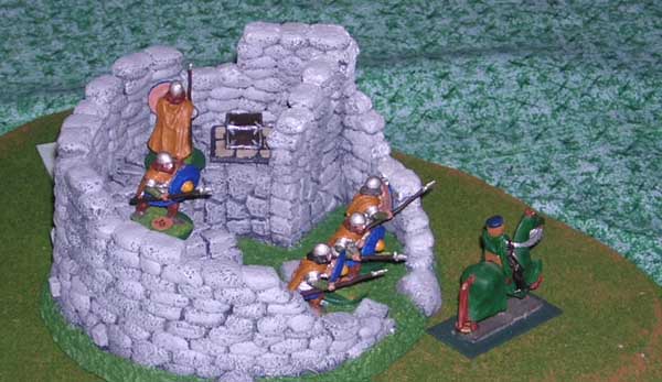 The Constable's men and Blackfeather's archer's meet in the village and fight. Mounted knights are riding between the wall and the building - but the archers held.
