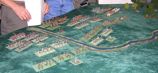 Phil Young - the Game-master - sets up the "southern" Romans. Behind him Paius Maximus Fred Diamond) and Agitatus Maximus (Robert Whitfield) watch and review the rules. The bald pate of Gladius Tucia is barely visible behind Mr. Young.