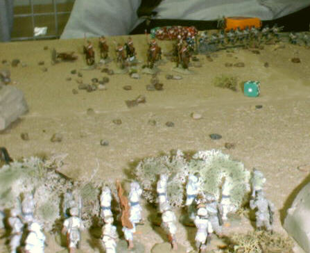 British Hussars, after executing a tiring flank march through a goat-trail over the mountains, ride towards the mosque of Babar. This mosque is THE victory condition. Should the British hold it at the conclusion of any turn, the shock will cause the Dervish forces to disintegrate. Alas, 'Emir Tubier' had posted sizeable reserves in the vicinity of the mosque (but not in it of course). Two units of fierce desert cavalrymen hurled themselves at the Hussars and after two turns, the outnumbered British horsemen had to fall back. The supporting two units of imperial infantry (not shown here) lagged behind the cavalry. Note the ridge in the background, crawling with dervish infantry all headed to the mosque to prevent it's defilement by infidels.