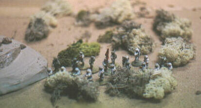 Dervish riflemen take aim from a position in the low ground, shielded by clumps of thorn brush. Anzac horsement and Indian infantry may be seen in the distance. This brushy area was attacked by the Indian infantry, who were then enveloped by more Mahdists from their left (the right of the picture).