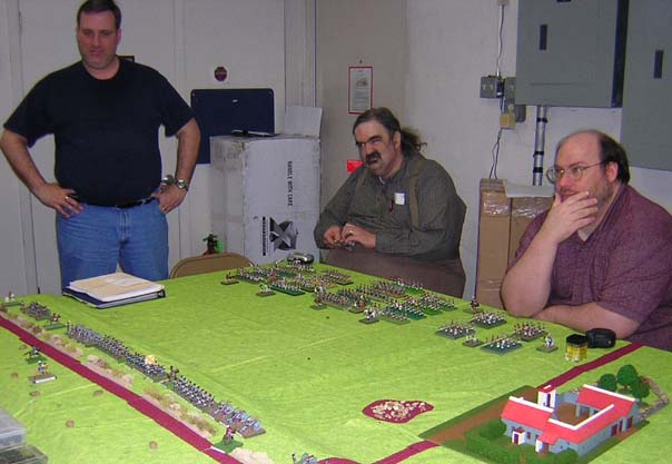 The French commanders (Left to Right): Fred Diamond, Rick Loveday and Jim Woodrick. They are placing some late arriving cavalry on the board in their first move. Loveday seems concerned about the quality of his men!