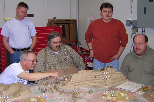 Jim Pitts (on left) the British commander and Eric Betts (standing in white shirt) attempt traffic control with the mass of units coming through the pass. Robert Whitfied (seated, mainly obscured behind Eric) whose real-life job is roadway design (& traffic flow) watches his Indian troops try to make thier way through the congestion. Bryan Thompson (in background) seems to have given up and just waits for the road to clear.