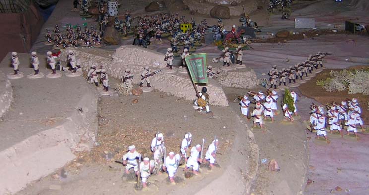 The British and Indian forces in khaki enter the table along the road to Barfus. They are jammed into a small area between the hill on the right and the edge of the table on the left. Pathans in white.(Sean Pitts' command) pour down the hill on the right, to attack the Ghurkas, dimly seen in green climbing the steep slopes.