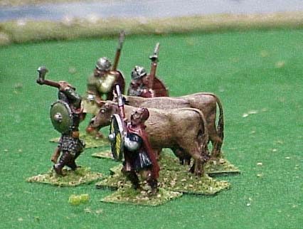 Saxons leading away a pair of oxen are attacked by an axman who wants those tasty morsels for himself!