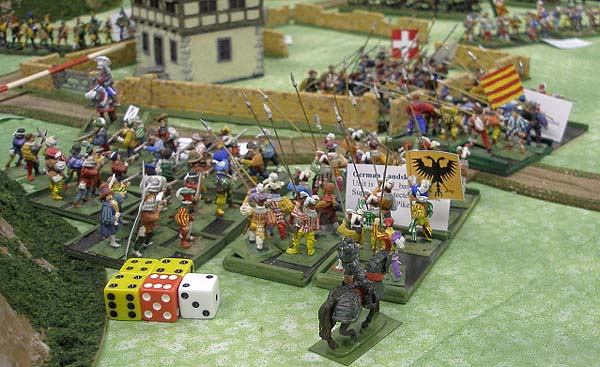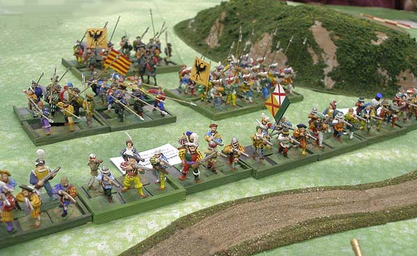 The game takes place somewhere in northern Italy between the forces of the Holy Roman Emperor and the King of France. The battle began with each army starting very close due to an early morning fog that concealed the army's set-ups from each other. The German battleplan was to use the mounted arquibusiers to screen the left flank while the gens d'armes and a reinforced pike brigade attacked on the right. The left wing of infantry was to protect the guns in the center and aid the left flank cavalry. This plan worked well.