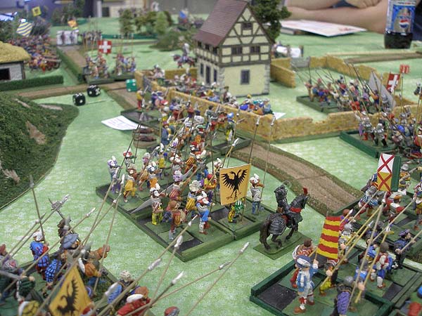 Larry Reeves German gens d'armes (on the left) face off against Ed Sansing's French command (1 regiment each of gens d'armes, mounted arquibusiers, and Swiss pike).