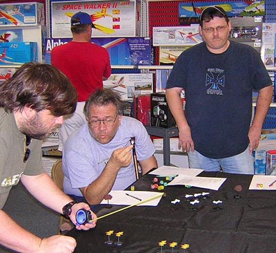 Commanders of The Empire of Man and their ally - The Star Kingdom of Altair. Ed Sansing was on this side but is not shown in the photos because he was taking them! Bryan Thompson (standing in blue shirt) looks on as Fred Diamond explains some of the rules to Mike Todd. Man in red shirt is not a gamer - but is a customer of HOBBYTOWN.