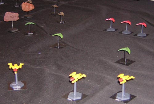 From Ed: "A view of the table as we all go into the fight." The brown/red rock asteroids were made by Jim Pitts out of pumice, so they really are rocks.