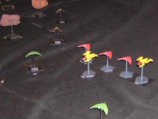 Sansing's squadron closes in on Sean's and Mark's. On the yellow ships, the "wings" are raked forward and the red area which looks like the cockpit is really the energy vents at the ships rear - so they always look like they are flying backwards!