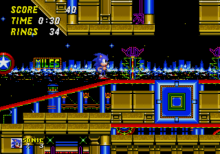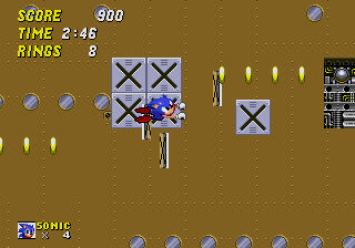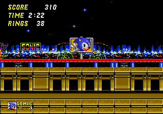 Sparkling neon lights and glittering gold fill the Casino razzmatazz! Play the machines with button A, B or C. Flip the levers and push down on the springs to send Sonic reeling like a bouncing Blue pinball!