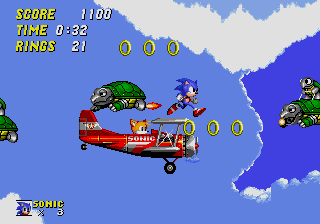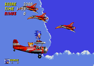 Robotnik has escaped to the sky! Sonic's a wing walker as Tails is at pilot in a battle above the clouds!