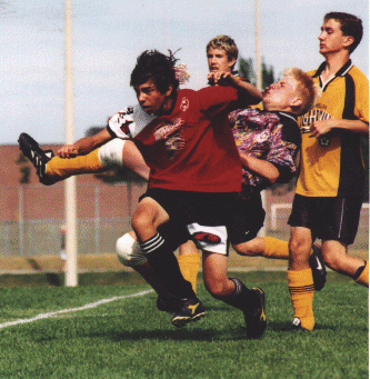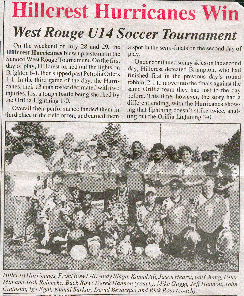 The Hurricanes success was a real team effort. Although it was extremely difficult to single anyone out, R. Jason Hearst (Goalkeeper) was selected by the Orillia Lightning as the most valuable player on the tournament championship team. He won a MVP medal, two gift certificates, and Toronto Lynx tickets in addition to the trophies he and his team-mates collected. - Rick Ross RIGHT PICTURE--> TOP ROW (Left to Right): Derek Hannon (Coach), Mike Gaggi, Jeff Hannon, John Cintosun, Ige Egal, Kunal Sarkar, David Bevacqua, Rick Ross (Coach) BOTTOM ROW (Left to Right): Emre Duzenli, Andy Blaga, Kamal Ali, R. Jason Hearst, Ian Chang, Peter Min, Josh Reinecke Top | Sport Scene Article of the Hurricanes Victory | Back | Next | Home |