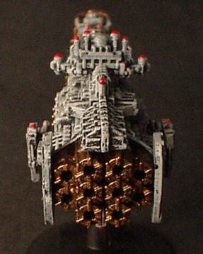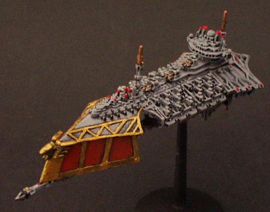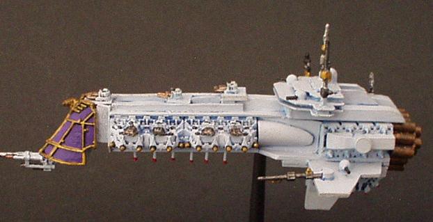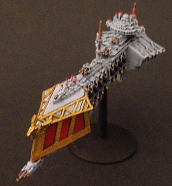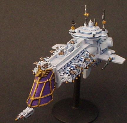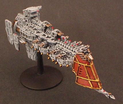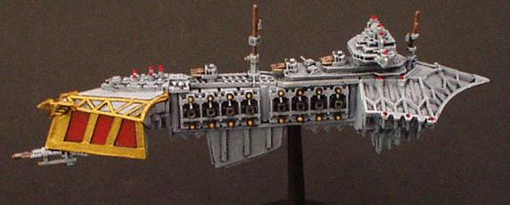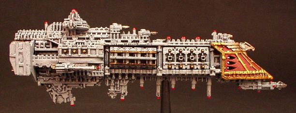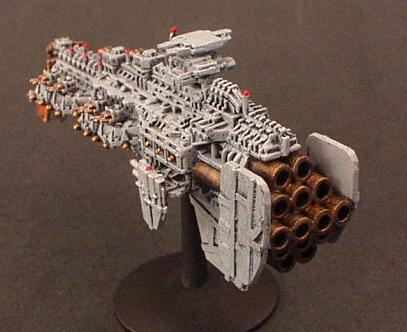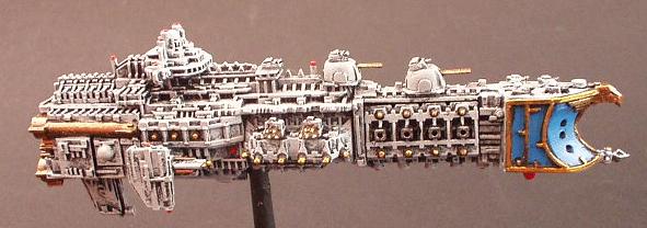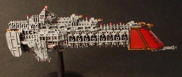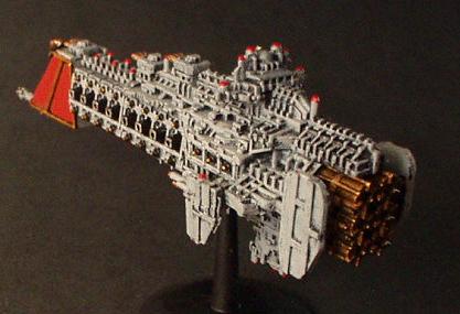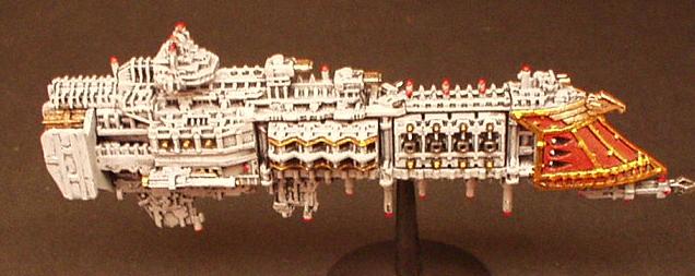 The "Divine Ruler" class was the natural development of the Valhalla Class vessels and an important link in the chain that eventually produced the warship designs of the modern navy. They are first registered during the 32nd millennium being built initially on Mars but variants have been seen that obviously bear the mark of yards all across the galaxy.. It combined most of the modern Imperial design features from the Valhalla and then some of its own. These are a landmark design in ship development in that they were the first to incorporate the slab sided weapons batteries that are now the hallmark of imperial gun ships and whats more it was the first design to include the formidable nova cannon as its prow armament. The ships were indeed a true Imperial gunship design. The combination of the long range capabilities of the NC and the versatile dorsal lances make it perhaps the first design to truly merit the name of battle cruiser. The vessels proved operationally and tactically successful but were never produced in large quantities. Like the Valhalla class many design concepts were even then almost beyond the capability of the empires shipyards and further building would have put a strain on the maintenance resources of the navy as it was at that time.. One of the more elusive factors that condemned the design to be produced in such small quantities was the fact that it was aesthetically a total disaster.. Although the ship does have its supporters the general trend of opinion is that the class is one of the ugliest ever produced (except perhaps for an Emperor/Repulsive hybrid emanating from the Henderson Yards at Cypra Mundi in the 39th millennium) . In time many commanders came to respect these versatile and effective vessels!! The combination of the ancient engines and power multiplier techniques with modern gunnery systems and operating practices produce a vessel capable of holding its own in any battle line.. The long-range capability is unmatched even by the mighty overlord BCs that followed the Acheron class! The class never exceeded more than 40 ships but is still in service today.. These highly decorated and desirable vessels are much coveted commands for young captains on their road to the admiralty.. In recent years one at least was despatched to the Golgotha spiral to bolster the imperial fleet stationed at the naval base at Golgotha prime. The vessel, named the "Royal Sovereign", is currently commanded by Cpt. Klaus Baumann. Baumann is of course famous for his defence of the Imperial research base at Extremis Segunda. Baumann commanded the base while under the freelance command of Inquisitor Van Haroom during his exploration of the galactic rim at the end of the Golgotha spiral.. The base was attacked by what are believed to have been pirates who, had it not been for the outstanding performance of both Baumann and the "Royal Sovereign", would surely have destroyed the Empires bridgehead in that remote regions and condemned Van Harooms expedition to total destruction..