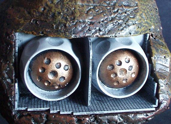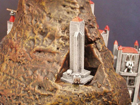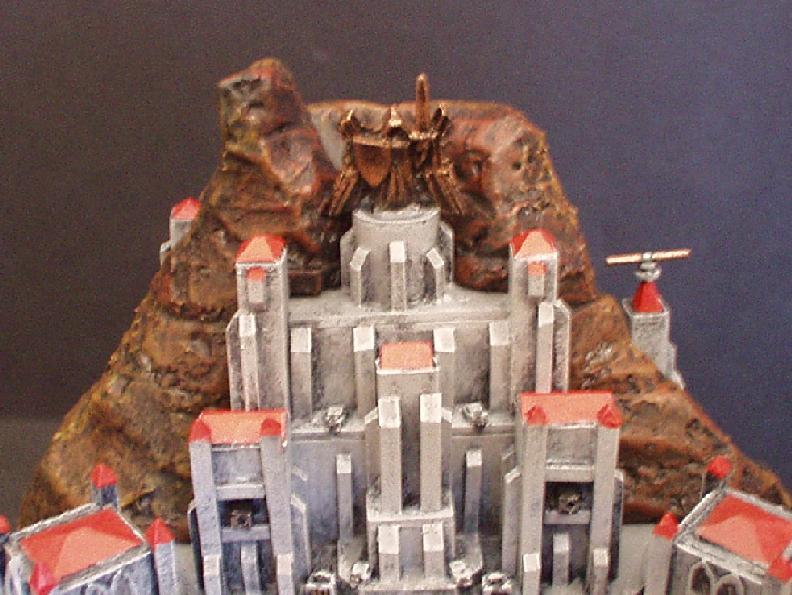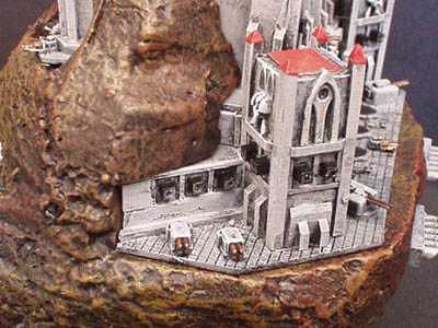 This is a project I have wanted to undertake ever since seeing White dwarf images of marine fortresses many years ago. In order to make the fortress look like part of the rock, I built the fortress model first and then built the rock around it using layers of polyfoam ceiling tiles. It is of course completely scratchbuilt using only turrets from both BFG kits and other naval kit manufacturers.