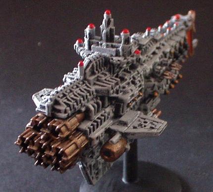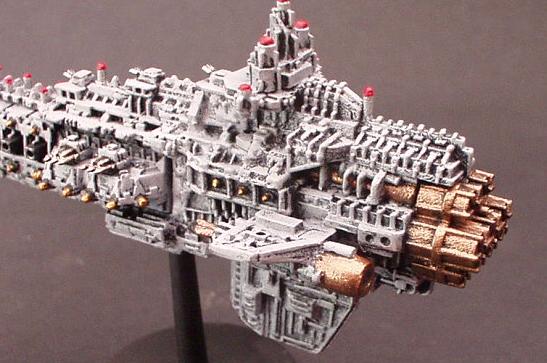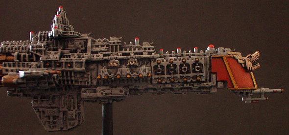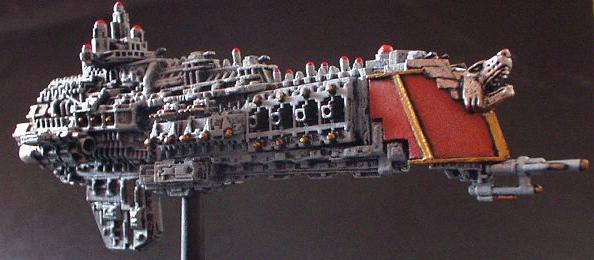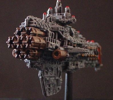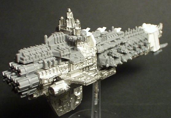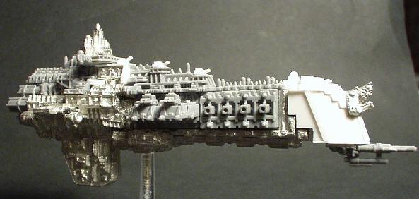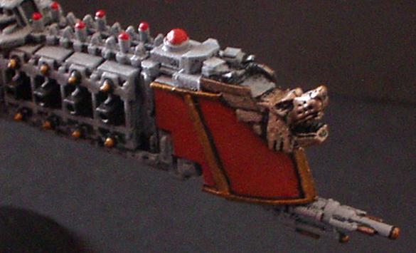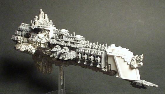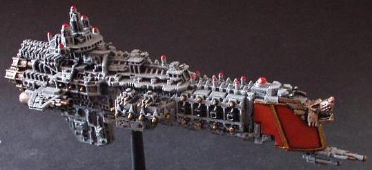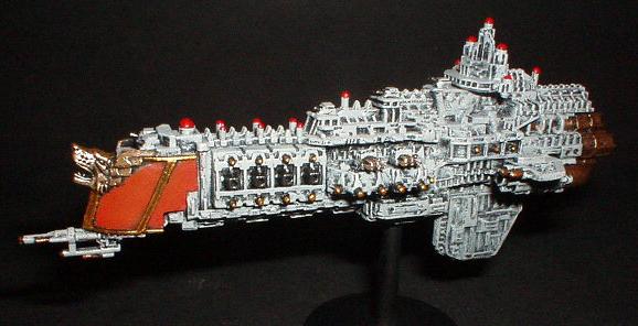 The ship began it's life as LUN132749 in the construction yards of Galliard VII sometime in the 27th millennium. After a long and colourful career the ship joined the cruiser flotilla of Admiral Heinrich "bear" Shecklin in the Kohinowa system, in the early years of the conflict with the Chainian Peoples Republic. The troubles that history remembers as the Rift Wars would last for nearly two hundred years. The Admiral adopted the LUN132749 as his flagship and it's efficiency and success in combat made the ship his pride and joy. In 467 M28 at the battle of Hi Chi Wen the ship was damaged after a prow ram of the Chainian carrier "Hoonsung" . During it's refit the admiral decided to endow the vessel with the figurehead of a winged bear as portrayed on his family's coat of arms. He also decided to use his personal right, to name vessels, to give the numbered ship the name "Ursus Alatus" or "winged bear". This practice although viewed with a jaundiced eye, are indulged by the Empire, especially when performed by it's more successful admirals. 47 years later some 20 years after the death of the admiral that gave it it's name , the Ursus was severely stern damaged in a one side battle with the Chainian dreadnought "Pride of Beijin". The engines were irreparable and generated only half power . A scrapping order was placed on the vessel. Just one week before the order was due to be implemented, a second lunar hulk was brought into the yards and an enterprising young tech priest decided to graft two of the hulk's engine tubes onto the exterior of the Ursus. The mod was successful and the ship was returned both to full power and Imperial service. The Ursus continued in imperial service and serves until today. it is now registered as a member of the 3rd Golgothan battle group stationed at Golgotha Prime naval base.