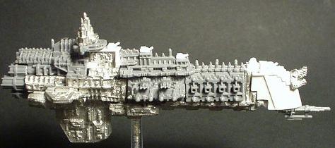 The model is a major conversion using a plastic cruiser, parts of a vengeance and a number of parts that I have no idea where they came from. The need for the model arose from my aim to have one of each ship in my Golgotha campaign Since I need 16 lunars this gets boring so I decided to build a number of subtly different models with distinctive construction differences and figureheads. the Ursus Alatus is the first. I have included some unpainted pics to give you an idea of what bits come from where.
