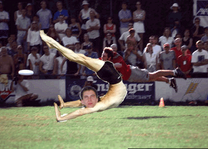 Shaun is determined to make a layout catch in the Purple Haze game, but somehow plants his face in the ground first, with the rest of his body refusing to stop. |