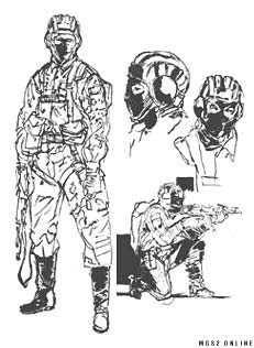 The core of the russian terrorist strike force which took over the tanker transporting Metal Gear Ray. Regular russian sentries which snake encounters roaming the ship on patrols are armed with an AKs-74u, using a suppressor, flashlight, and laser-sight. If this sentry spots snake, a dead body, or any kind of visual of snake, he will radio in to a "Command Post" which would send in a "attack team" upgraded with body armor, kevlar helmet, and sometimes a ballistic shield. These teams will hunt you down and give snake quite a chase until hes dead or they lose site of him.