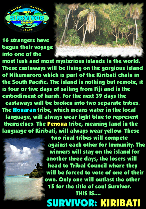 The Game Has Been Canceled: I'm very sorry to announce this, but unfortunately Survivor: Kiribati has been canceled. Due to problems beyond reconciliation, the game will not be starting back up. I'm very, very sorry once again. I want to thank the cast members who dedicated their time for doing such.