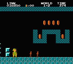 This is one for the Zelda fans who think Mario is overrated. Mario, of course, becomes Link. Luigi is a fake alternate character named Blink who is a blue Link. The Goombas have been replaced by Octoroks, the Koopas are Re-Dead, and there are several other graphics changes. The Fire Flower has been changed to a boomerang, and Link's color scheme no longer changes when it is used, so that it is more like an item from Zelda than Mario. Definitely one of my better hacks. It works on most emulators.