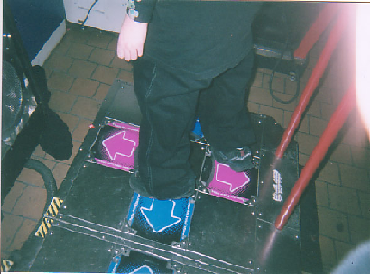 Barrie's feet on the ddr pad are moving because she is playing DDR .