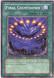 Note that Final Countdown is just 20 turns; your's AND your opponent's. So at each End Phase, that counts as one turn. In reality, your opponent only has 10 turns to beat you (which is still a lot, but not compared to 20 turns). Final Countdown DOESN'T STAY ON THE FIELD. If it did, it would simply be unplayable. Final Countdown gets played, and then the turns rack up. Once it's played, unless it's negated right then, there's no way to stop it.