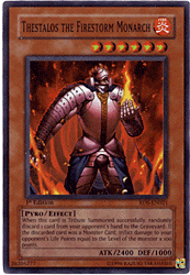 Finally, Thestalos the Firestorm Monarch. This rounds out the Monarch trio (Zaborg, Mobius, and now Thestalos) and this one hits the hand. When its summoned, it randomly discards a card from the opponent's hand. If the discarded card is a monster, deal 100 direct damage for each level it is. The direct damage is just icing on the cake, really. It's a 2400 hand depletor, and with all this Fire support it fits VERY nicely.