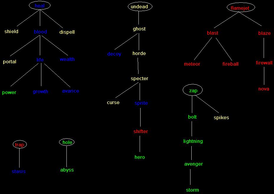 | Air Tree This tree is all about summoning spells, the main tree is air, but other (powerful) summon spells open up at the end. 1: Undead (Opens Ghost) 2: Ghost (Opens Decoy and Horde) 2a: Decoy (Water) 3: Horde (Opens Specter) 4: Specter (Opens Sprite and Curse) 4a: Curse 5: Sprite (Water - Opens Shifter) 6: Shifter (Fire - Opens Hero) 7: Hero (Spirit) |