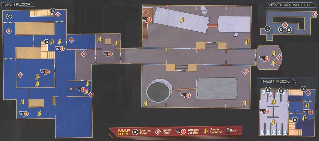 These pictures are from the Perfect Dark Strategy Guide and provide a detailed view of the multiplayer levels from Perfect Dark including weopon pickups and spawn points.