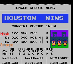 Pushed F11 instead of F9 and neither of us got the screen capture before the game reset. Would have been a great game to look at the newsapaper. Joe was the Angels and Scroope was the Mets. Joe won 1-0. I was getting no-hit until HoJo pinch hit 2 big hits. His effort was not enough. Final Score: Joe Dirt: 1 Scroope: 0