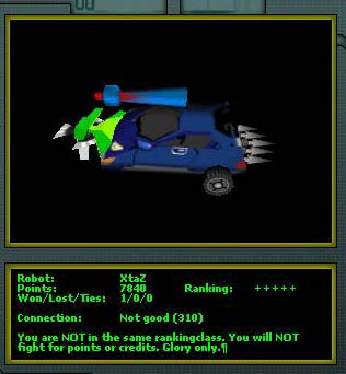 The bot doesn't have a tower at all! Torn is tower and there should be t1 or t2 or t3 for a tower! This bot has 245 armour, dagger, nuclear batteries, Laser, Guided Missiles, 5918 credits, small chassi, Large deluxe motor and 6 large wheels! He is a hacker (44-0 13244 1/2/2 W 0.00 1 0 0.3 0.000 0.000 85.240.160.216 clev14.com GET /~kevindey/cgi-bin/chat.pl /1.1!) name Dalmat!