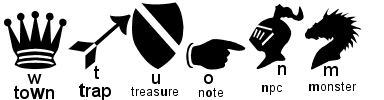 Below you can download the adventure font used for 3rd edition adventures. There are 6 symbols, as represented below:
