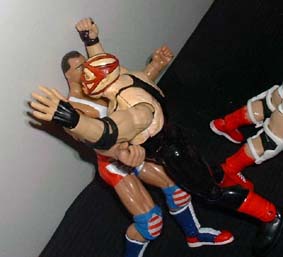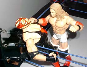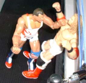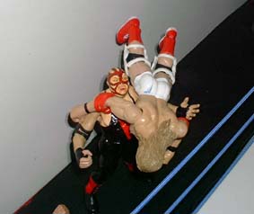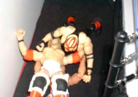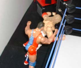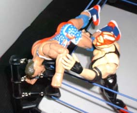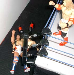 then drops him onto the corner post, and then Angle drops out of the ring.