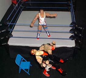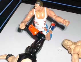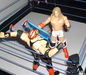 Vader staggers to his feet but Christian slams him in the head with the cold steel, sending him over the top rope.