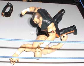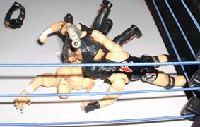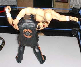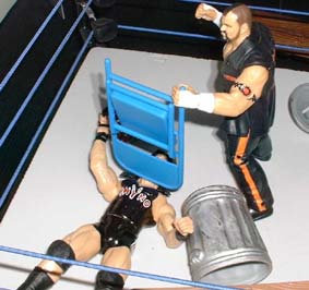 Tazz then slams the chair into Rhyno's throat and chest.