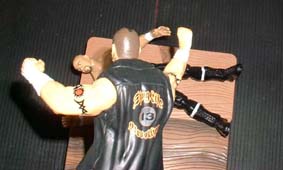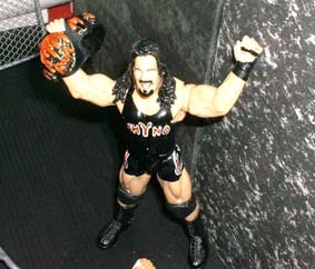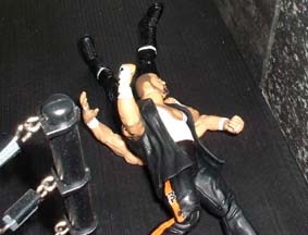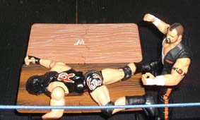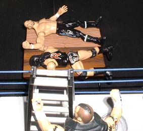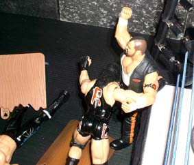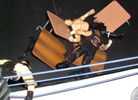 Tazz is in real control here, he sets up two tables and positions Rhyno on them.