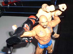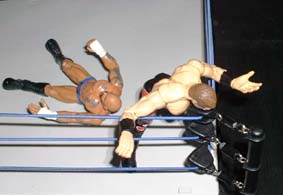 and then drags him to the top rope, and delivers a huge samoan drop.